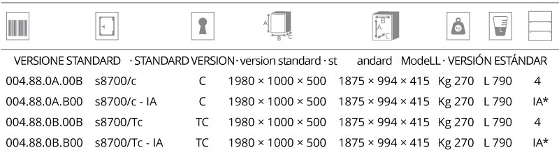 | S8700/C – IA | Chiave | 1980 × 1000 × 500 | 1875 × 994 × 415 | Kg 270 | Lt 790 | IA |